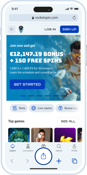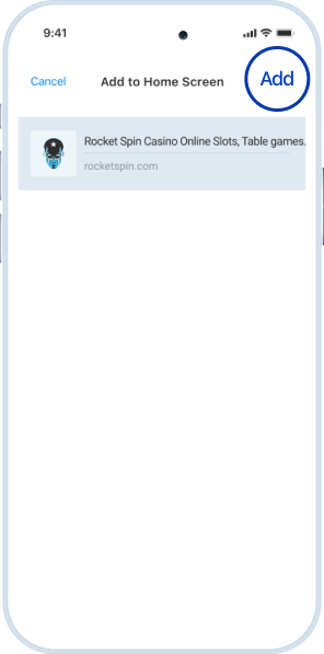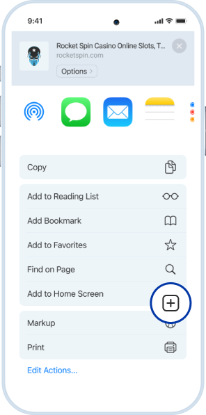 Open rocketspin.com with Safari, tap “Share” on the bottom navigation panel
