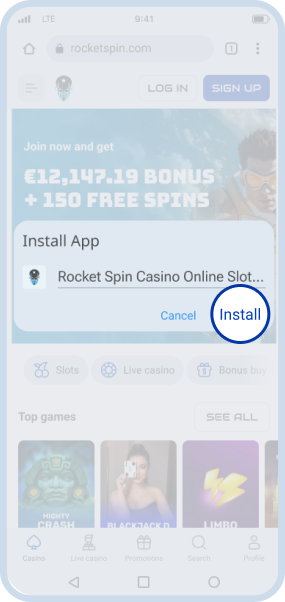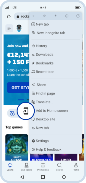 Go to the Rocket Spin homepage and tap three dots to open the browser menu.